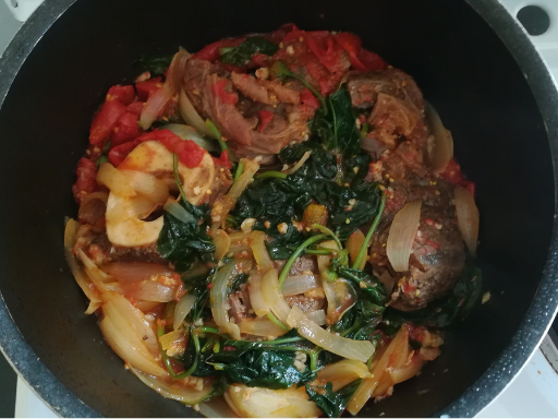 Romazava is a light, brothy stew made with leafy greens, meat, and minimal seasoning. The broth is clear and savoury, with greens softened but still distinct. The dish is mild and restorative rather than rich, designed to accompany rice.